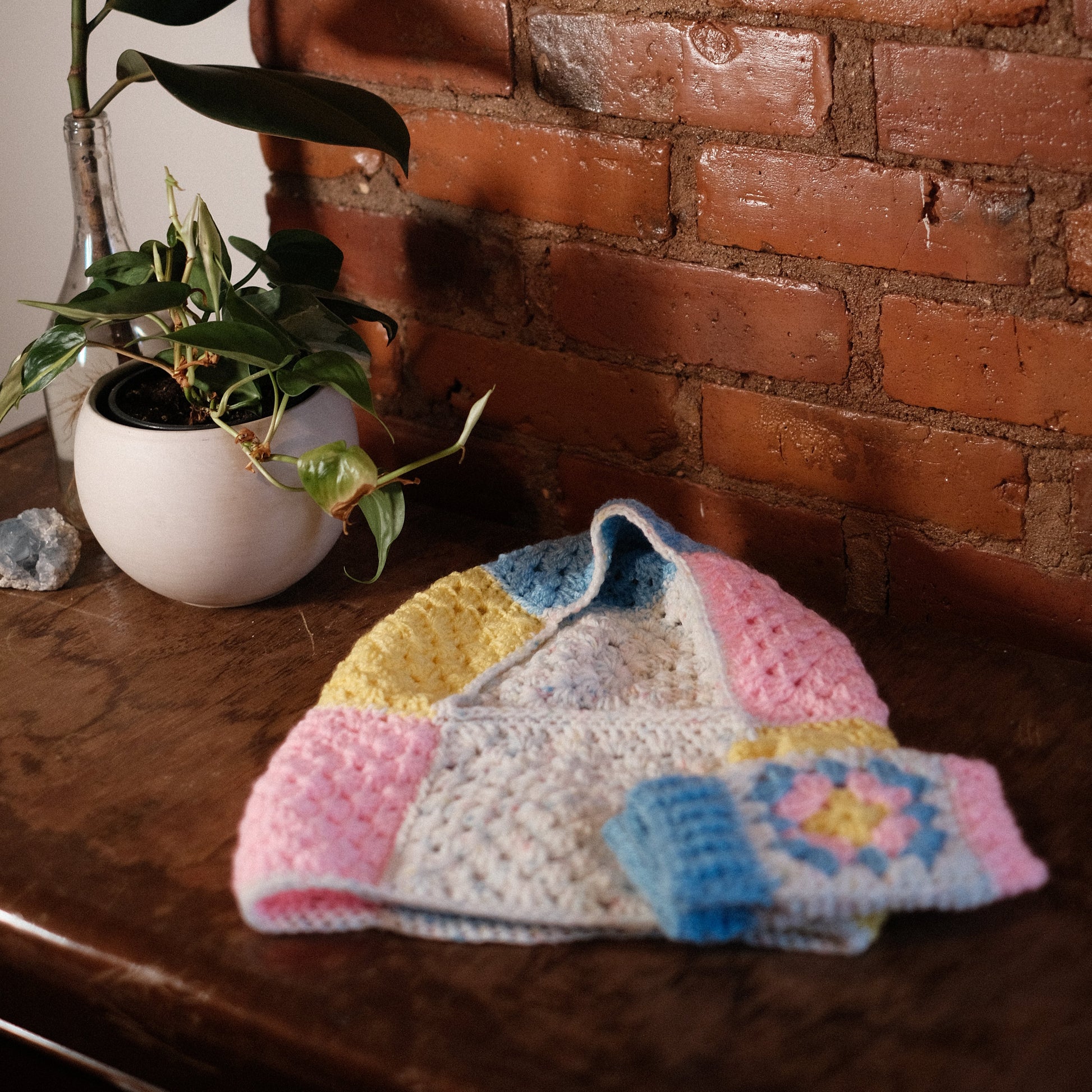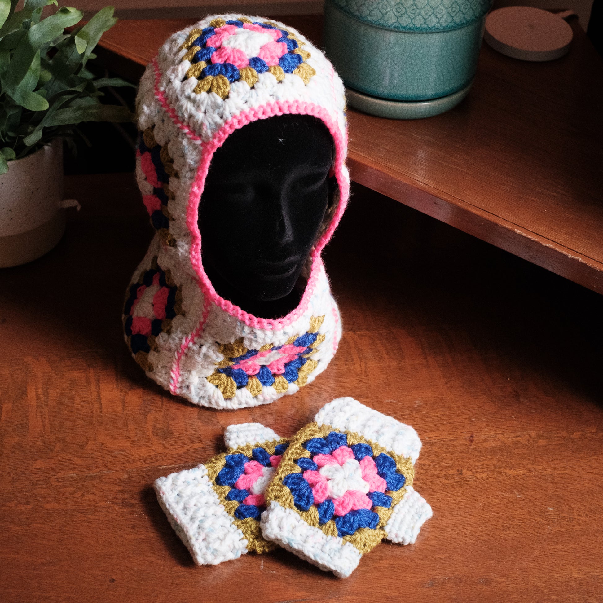 Experience nostalgia and warmth with our adult one-size-fits-all handmade cotton & acrylic balaclava and fingerless gloves! Inspired by my childhood, our color combos add a playful touch to your winter wardrobe.